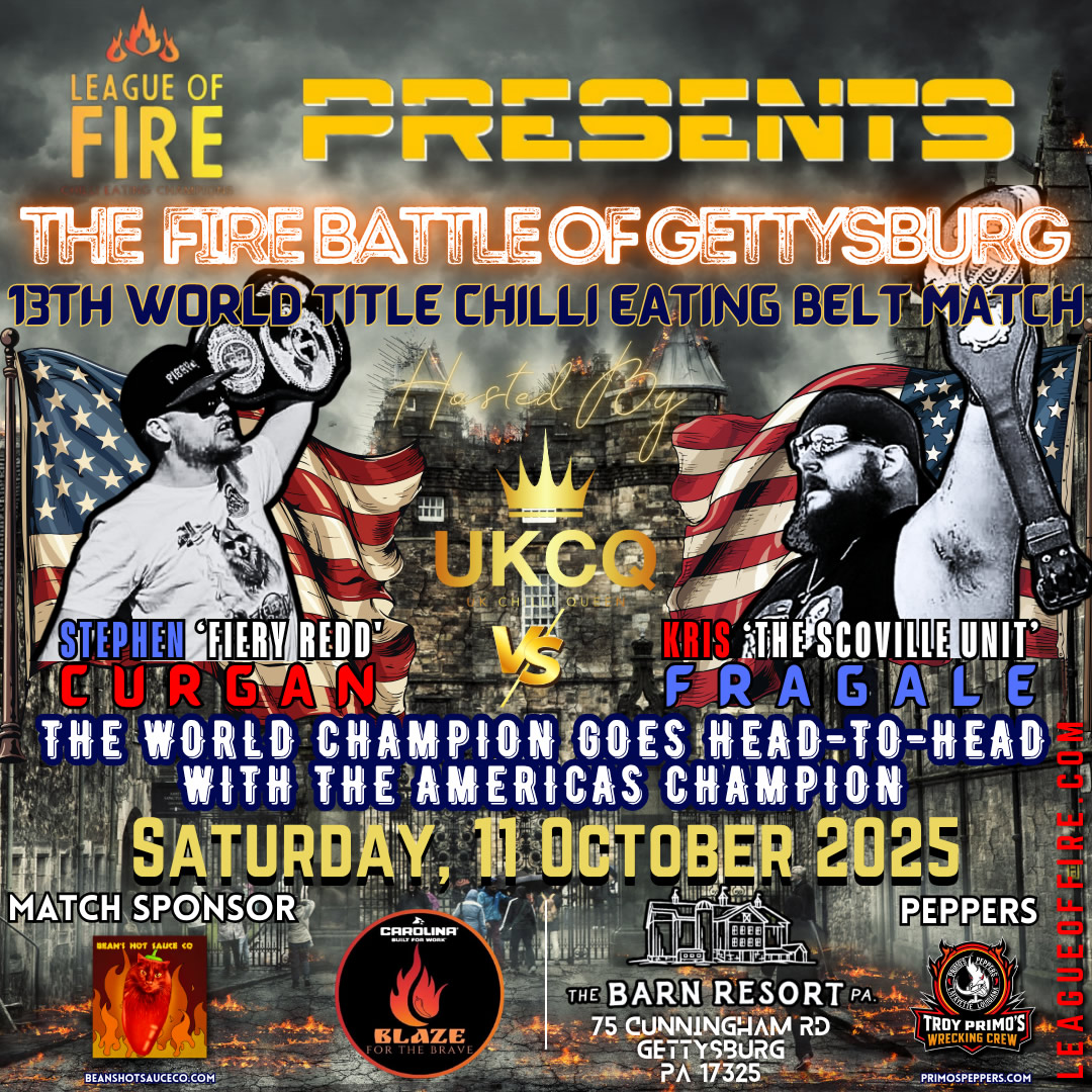 🔥 BREAKING NEWS 🔥 The League Of Fire World Title Chilli Eating Belt Match RETURNS TO THE USA for the first time in 6 years! 🇺🇸 AND… we are excited …