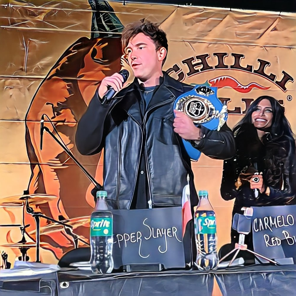 When we first came up with the idea of putting two renowned chilli-eating machines Johnny Scovile from USA and UK Chilli Queen in an inaugural World Title Chilli-Eating Belt Match in July 2019, at the Guildford Cheese & Chilli Festival, we had no idea how this new and first-of its-kind concept was going to take off and capture the fascination and hearts of the worldwide chilli community and help bring people from all parts of the chilli world together talking, forging bonds and friendships, as well as non-chilli-heads who have really gotten into this. We believed this World Title Belt Match could be an amazing innovation within the chilli community worldwide, and boy, were we right. Johnny Scoville vs. UK Chilli Queen in The Ultimate Chilli-Eating Showdown became a historic day for the League of Fire!