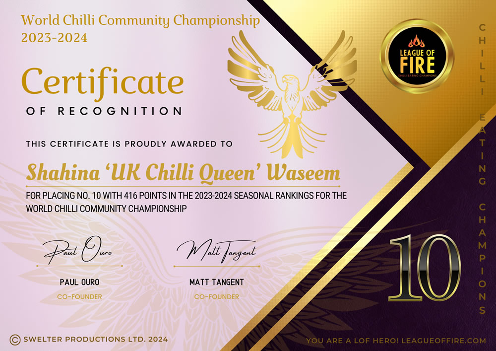 Welcome to our exclusive gallery of the top 10 certificates from our thrilling 2023-2024 World Chilli Community Championship (WCCC) season!